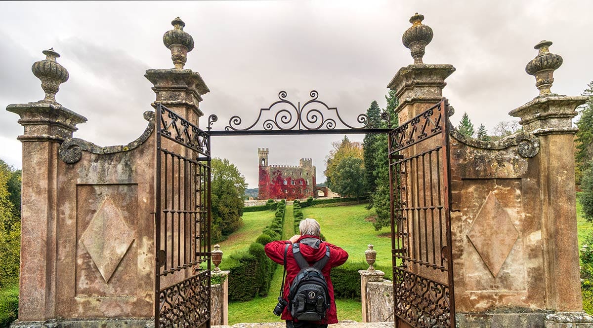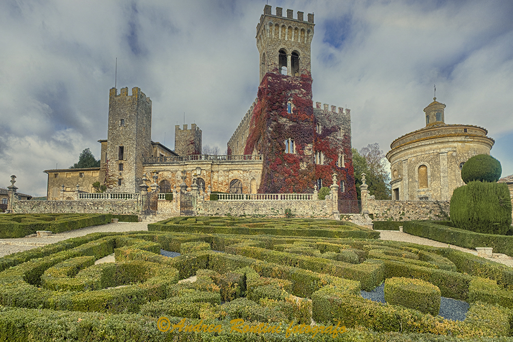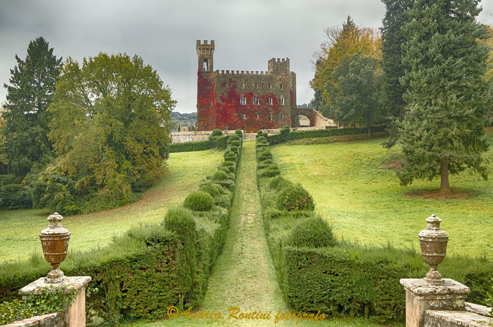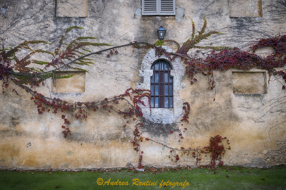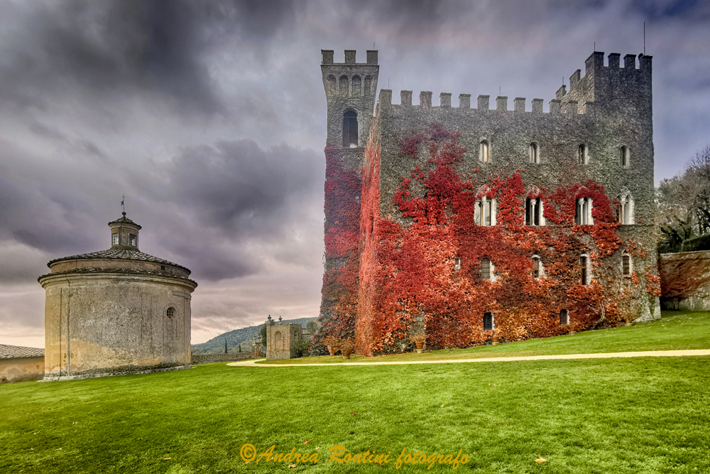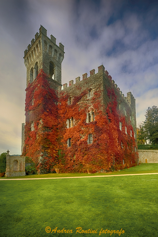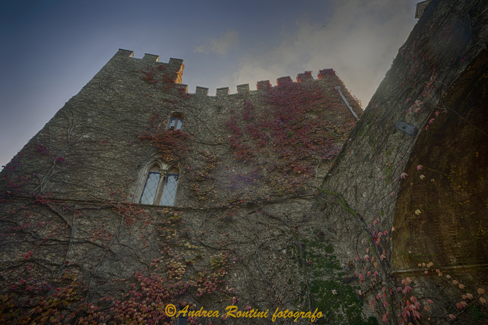 Le foglie rosse della vite americana rampicante avvinghiano il Castello.