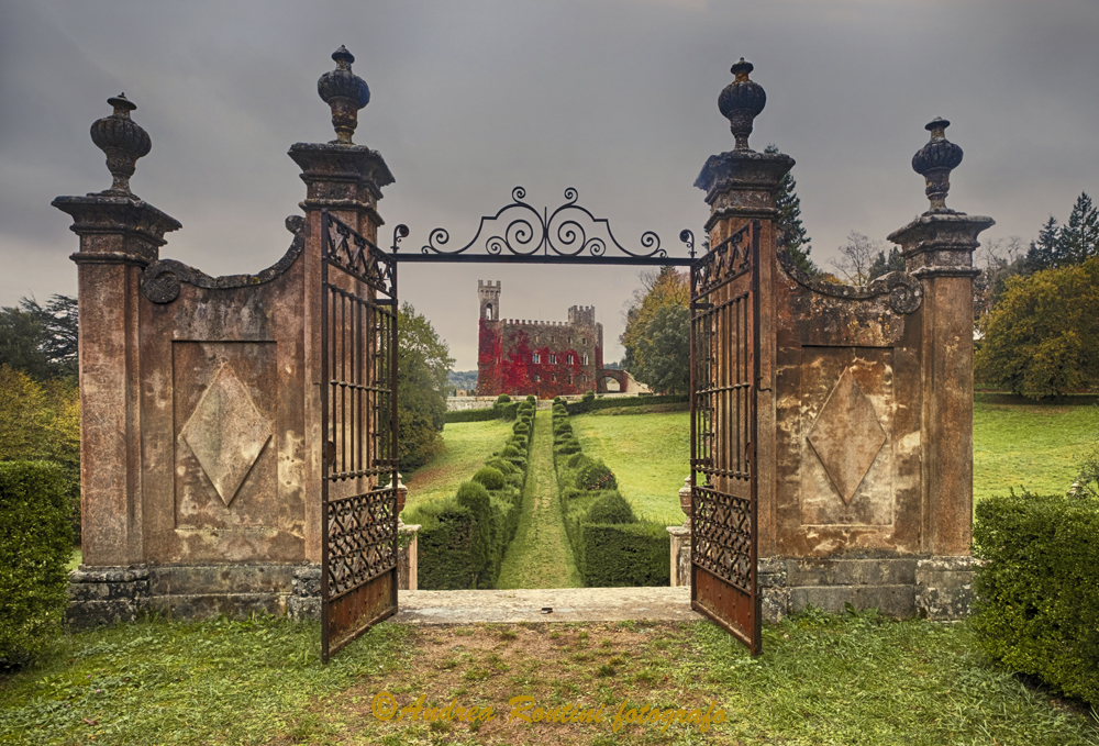 La scena teatrale dalla Peschiera: il cancello si apre, attraverso il viale, al Castello
