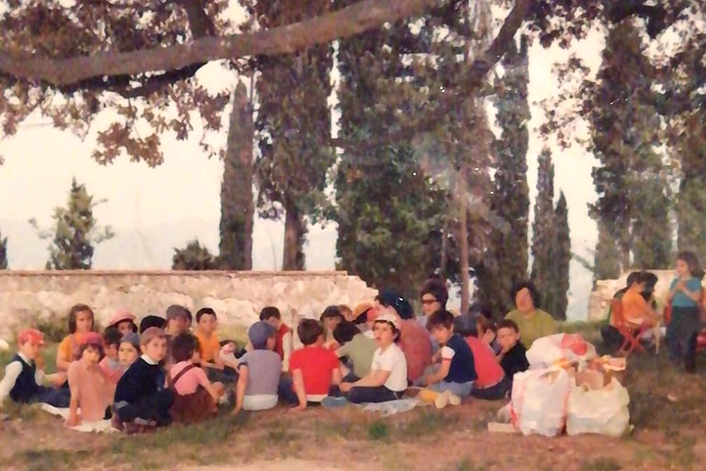 Scolaresca al Leccio sotto le grandi chiome in una foto del 1978