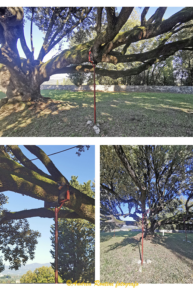 2 – Interventi diretti sul Leccio medesimo: Potatura di rimonda dal secco su tutta la chioma, progettazione e realizzazione di consolidamento meccanico statico a mezzo di puntelli delle branche a portamento orizzontale quindi a prevenzione di fenomeni di schianto.